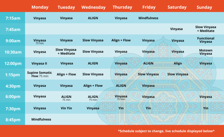 Pre-register to hold your spot up to 5 minutes before a class begins or drop in for any class, any time. Our offerings include Align, Vinyasa, Mindfulness, Yin, and Restorative.