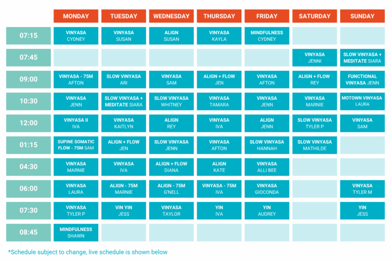 Pre-register to hold your spot up to 5 minutes before a class begins or drop in for any class, any time. Our offerings include Align, Vinyasa, Mindfulness, Yin, and Restorative.